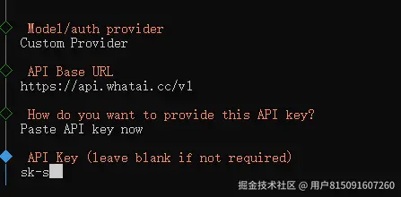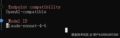 输入模型BaseURL:https://api.whatai.cc/v1,输入对应的API Key,选择OpenAI-compatible,输入模型ID如:claude-sonnet-4-6