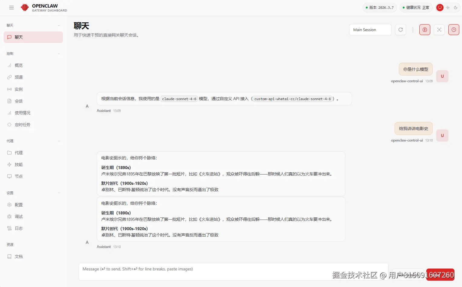 配置完成后,会自动启动Gateway服务并打开Web UI(http://127.0.0.1:18789/chat)