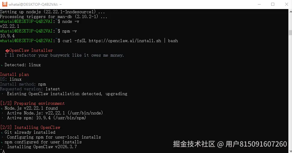 如果显示版本号(如 2026.3.7),说明安装成功!