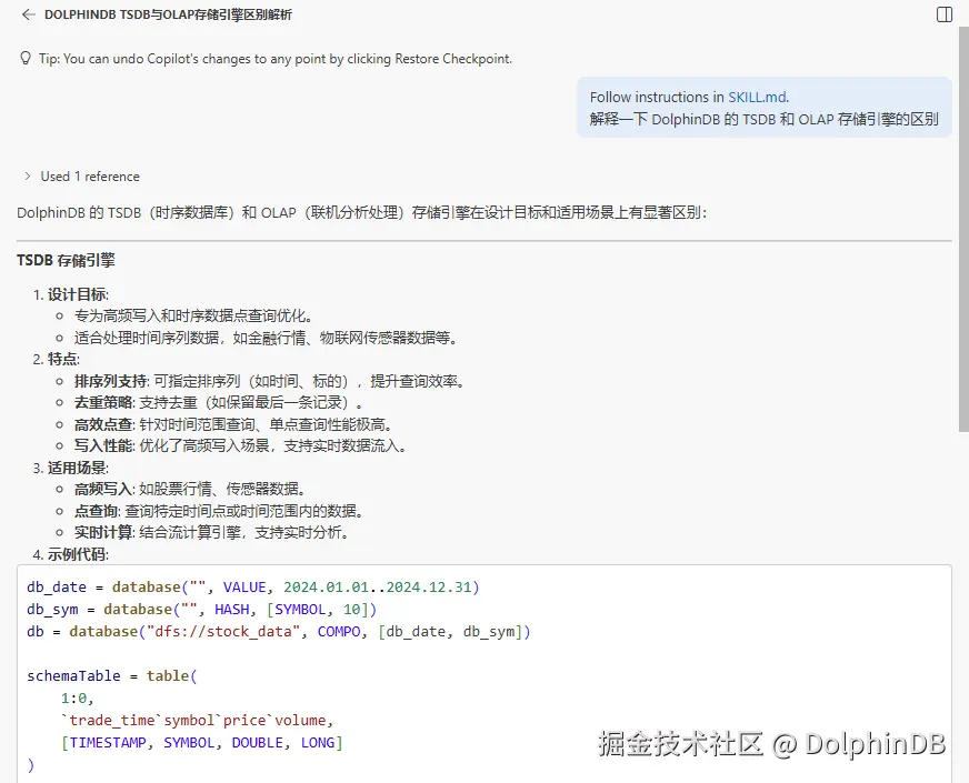 DolphinDB Skill 会结合官方文档内容,用通俗语言拆解知识点+搭配示例,边开发边学习,无需额外查文档。