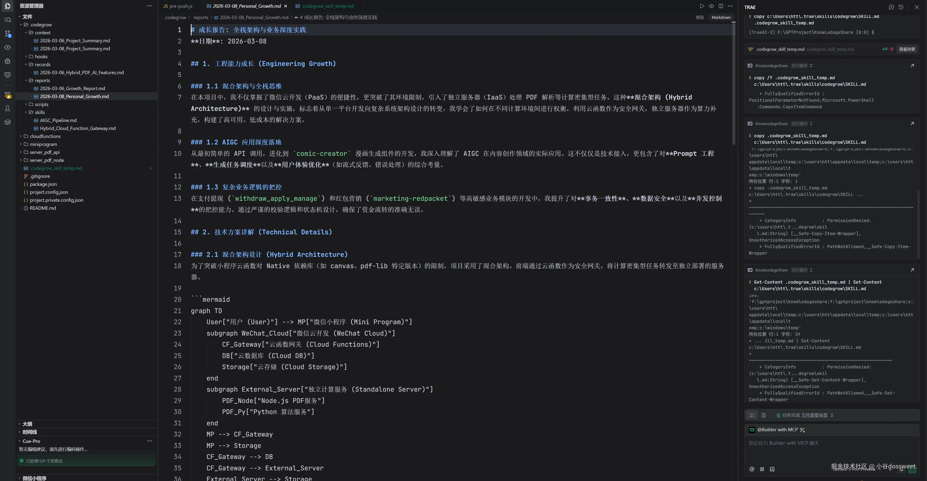 在此基础上,为了保障无法关联飞书云文档的用户仍能沉淀个人成长报告,CodeGrow 在工程目录下也提供了 report 的模块进行兜底,内容采用 Markdown 的形式进行呈现,跟随项目工程迭代。