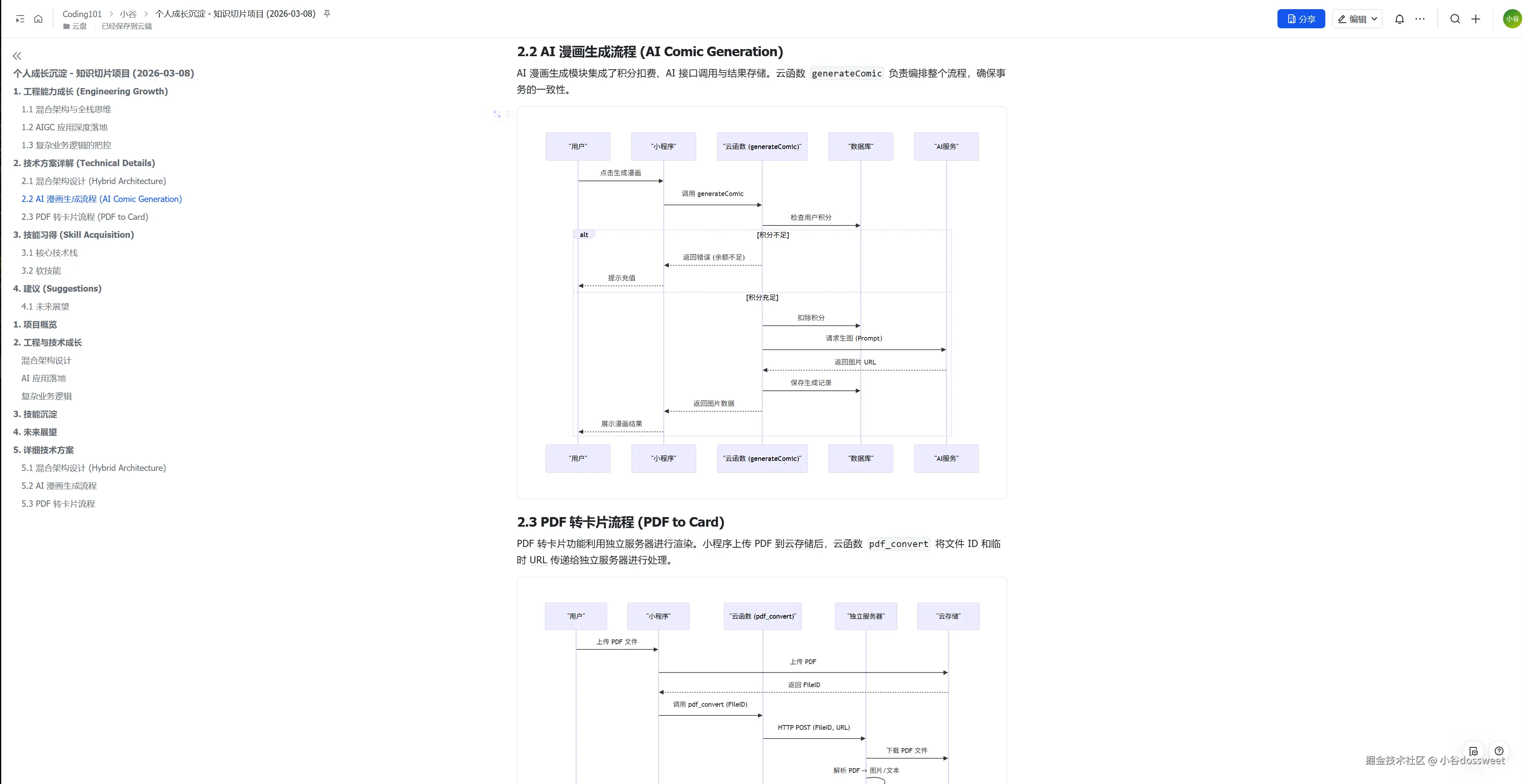 -   **飞书文档** : 已创建 [小谷成长记](https://feishu.cn/docx/Bhzvd9F4Wocrmexs33Dcc54rnAb),包含详细的技术方案、架构图(Mermaid)与时序图。