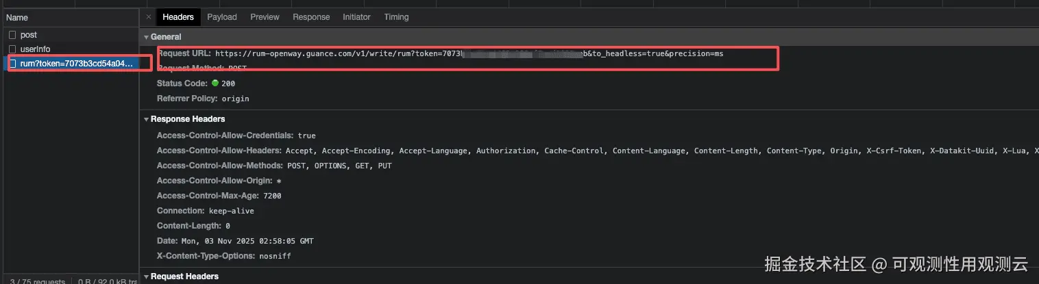 3、本地运行项目或者打包发布测试后,通过观察接口调用发现 /v1/write/rum 接口成功调用,说明数据成功上报,可在对应应用的查看器查看上报数据。