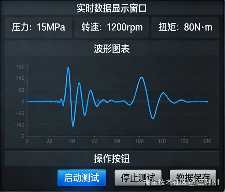 LabVIEW 的前面板设计为可视化操作界面,模拟工业现场测试面板,实时显示液压马达的转速、转矩、回油流量、补油压力、泄漏温度等关键参数,同时设计马达正反转、加载控制、冷却控制等操作按钮,实现试验过程的手动与自动控制切换。后台通过循环采集函数实现数据的连续采集,利用波形图表控件将压力、流量等参数以时域波形形式实时展示,直观反映参数变化趋势,便于测试人员及时判断液压马达运行状态。