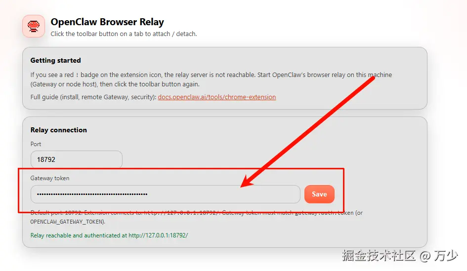 OpenClaw Browser Relay插件,粘贴进去你的 token配置 -