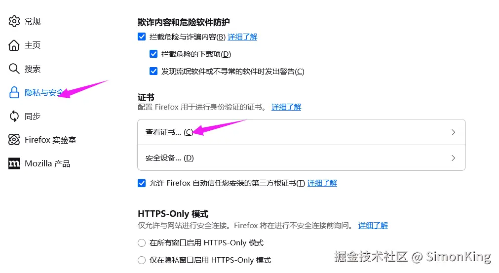 在Firefox浏览器中通过设置->隐私安全->证书->查看证书->导入可实现证书导入