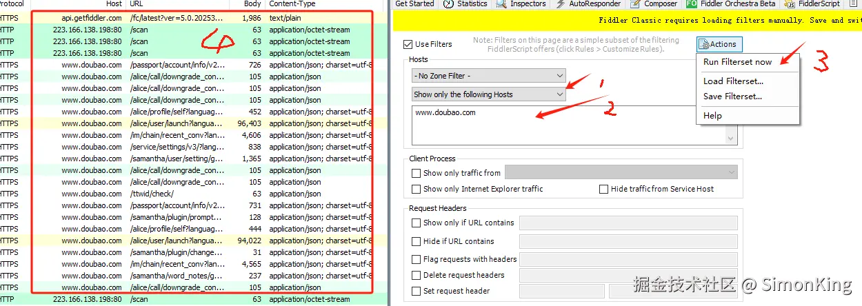 页面的请求比较多,我只能看到特定的请求,只需要在右侧的Filters中按照步骤设置,即可出现4的过滤页面