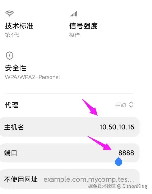 WLAN,长按当前WiFi选择"修改网络" - 展开高级选项,代理选择"手动"