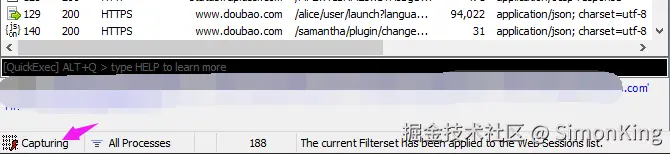 左下角这里点击一下Capturing,Capturing消失表示进行性代理;再次点击Capturing就会出现,可以实现快速切换。