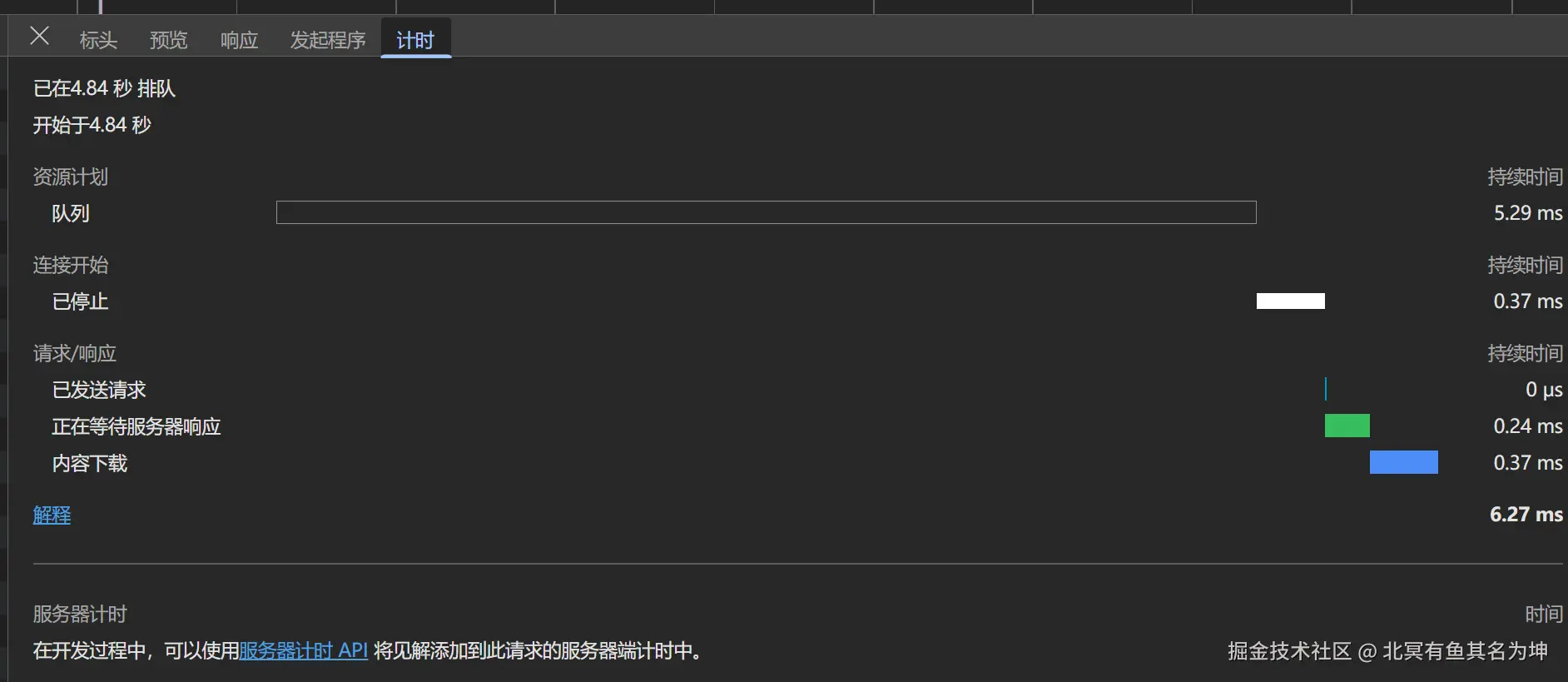 - Stalled:请求已准备好,但被浏览器强行暂停近 5 秒!