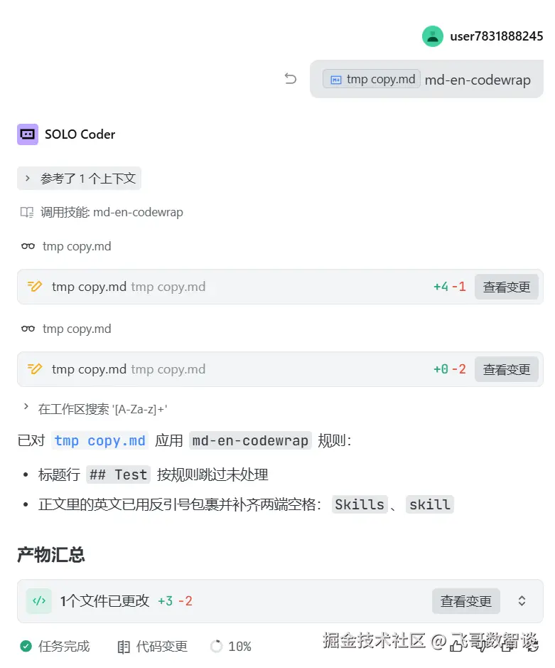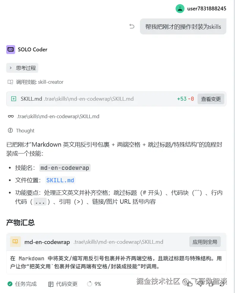 对话倒是也能解决,但每次输入好几个字的对话感觉有点烦,于是就直接让 TRAE 自己实现一个自动使用 ` 包裹英文单词的 Skill。