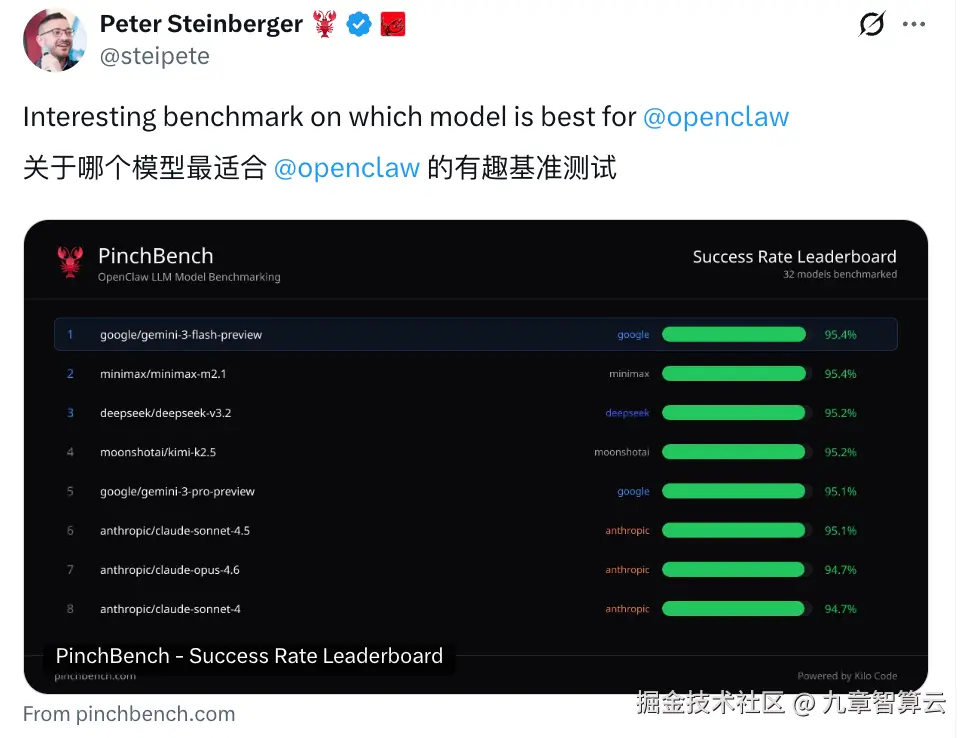 OpenClaw 创始人 Peter Steinberger 分享这个龙虾基准测试排行榜。