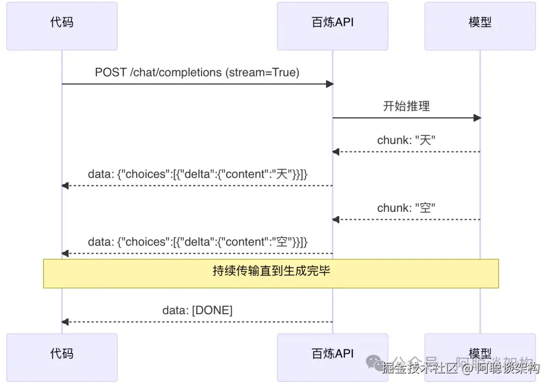 非流式调用需要等待模型生成完所有文字才返回,如果生成 500 个字,你可能需要等 3-5 秒才看到任何内容。流式调用(Streaming) 让模型边生成边输出,用户体验大幅提升。