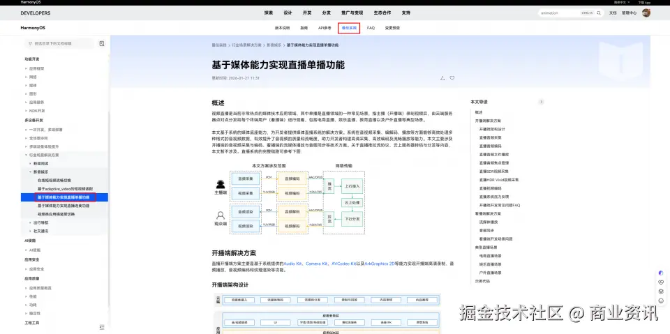 如何在鸿蒙应用中实现丝滑稳定的直播体验?华为在 HarmonyOS 开发者官网发布了《基于媒体能力实现直播单播功能》最佳实践文档,从直播开发全链路出发,提供开播端的音视频采集与编码、看播端的流媒体播放与音画同步等技术方案,并结合直播典型场景的常见问题与解决方案,提供架构图、流程示意和示例代码,帮助快速打造丝滑稳定的直播体验。