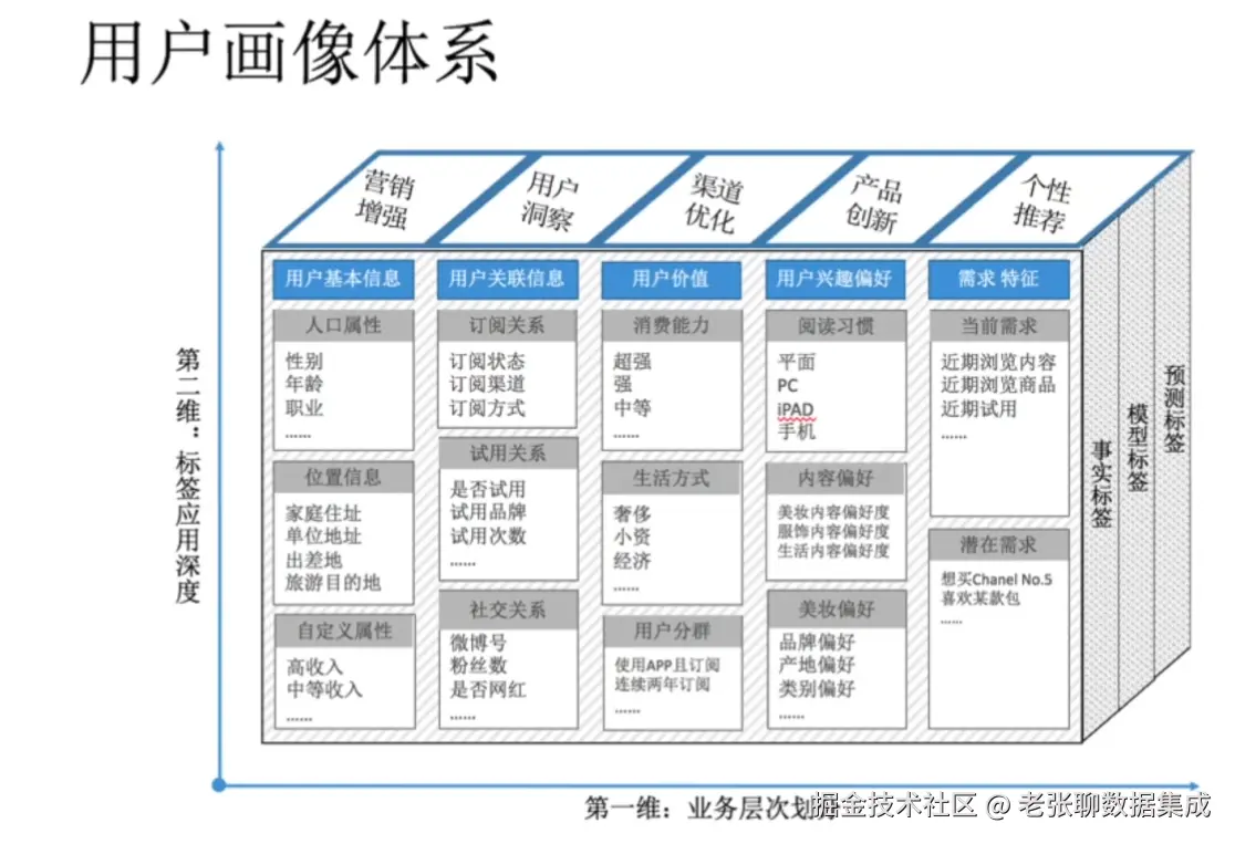 - 模型标签:通过算法模型预测出来。 比如预测一个用户“换机意愿强烈”或“有购房潜力”。它带有预测性,也是动态变化的。
