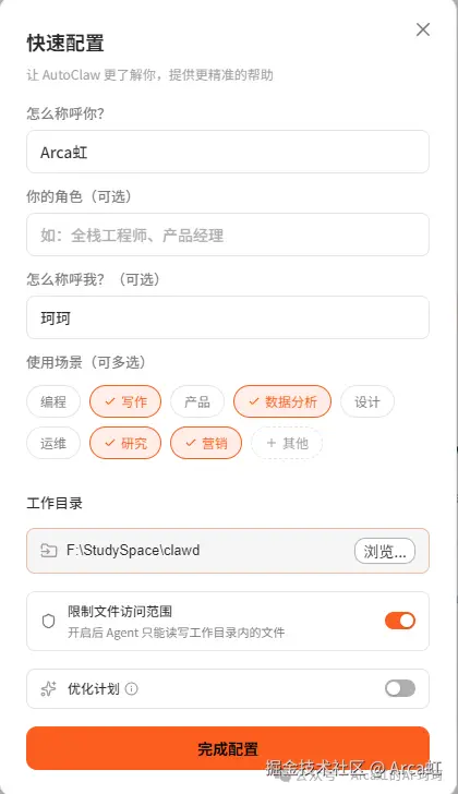 可以设置工作目录,开始“限制文件访问范围”,让小龙虾工作在沙箱环境下,就不用担心安全问题了。