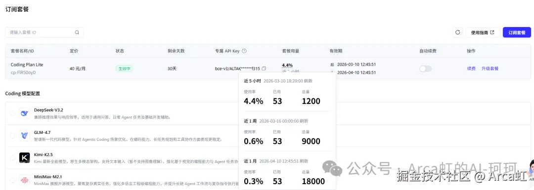 笔者自己是开通了百度千帆的Lite套餐, 首月付费7.9元,总共支持单月18000次的调用总量,开通后,可以选择如图的模型进行配置。