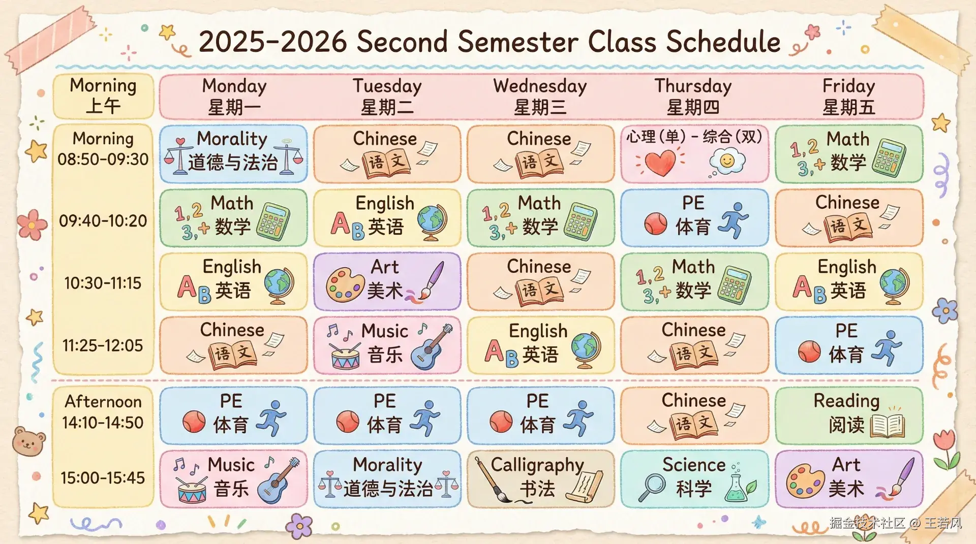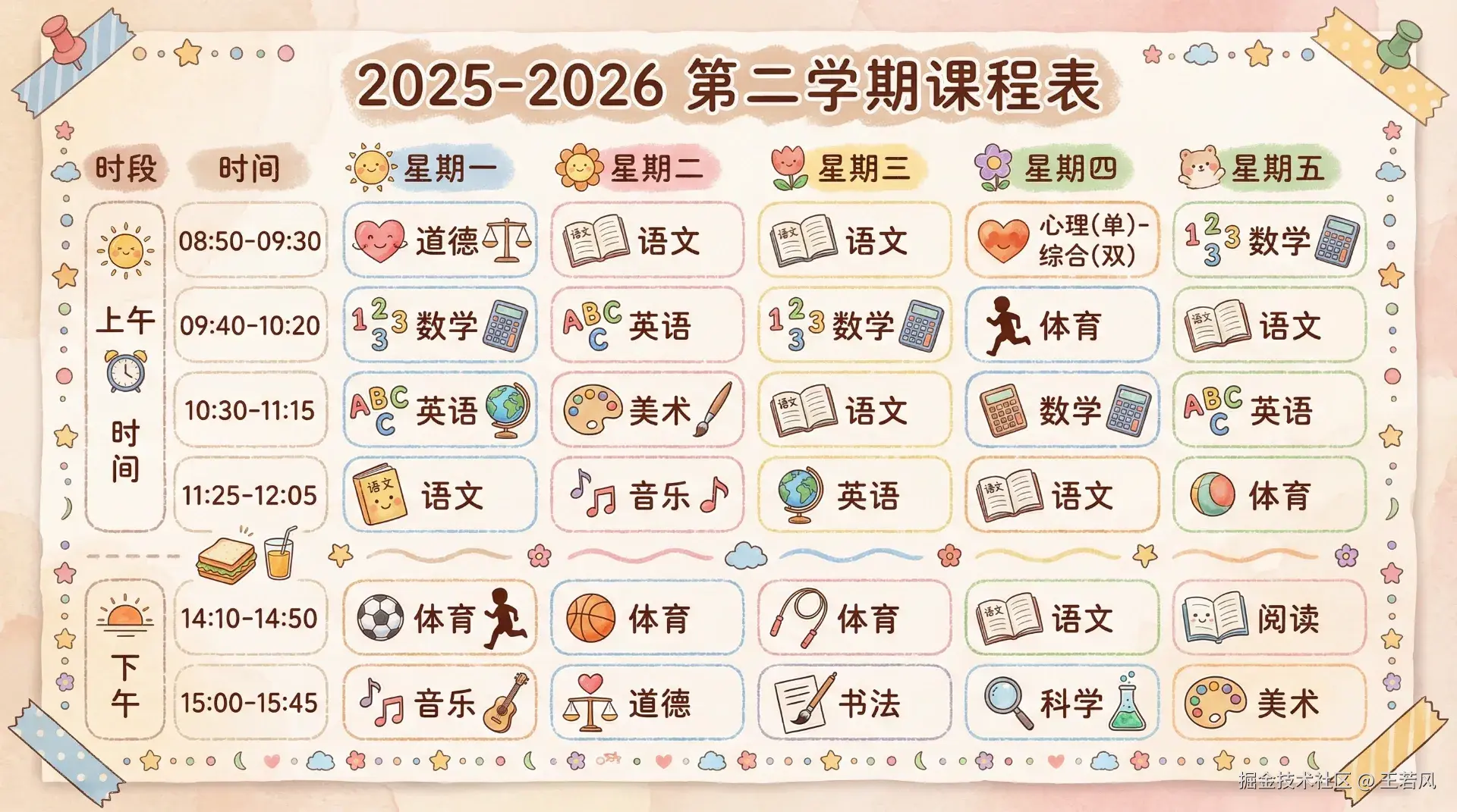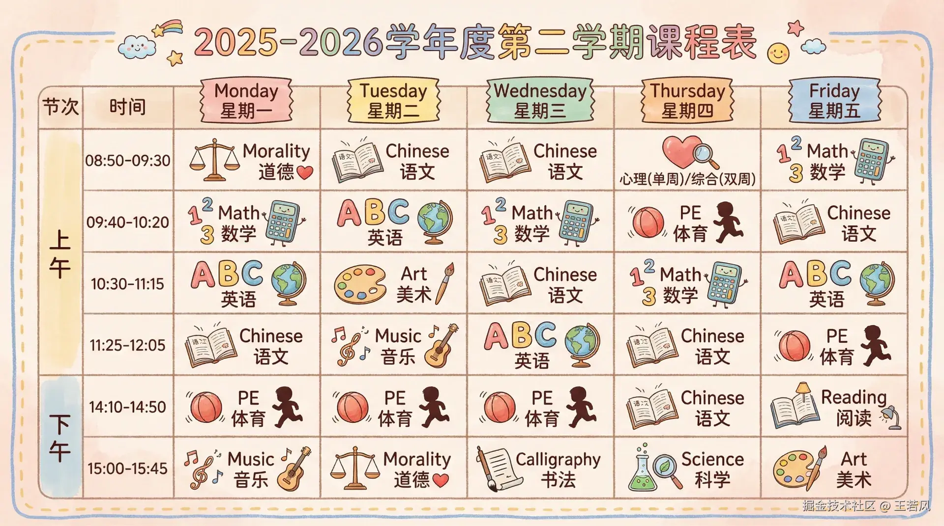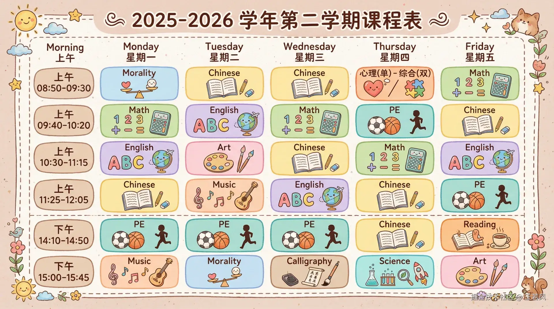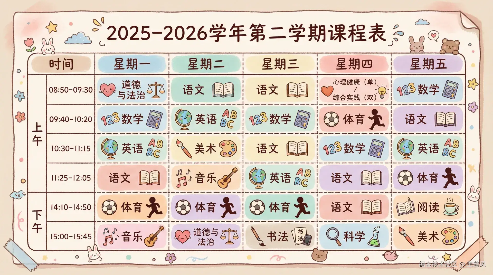 手绘风格的小学课程表海报,4k高清,温暖的粉彩色调,可爱的卡通插画元素。