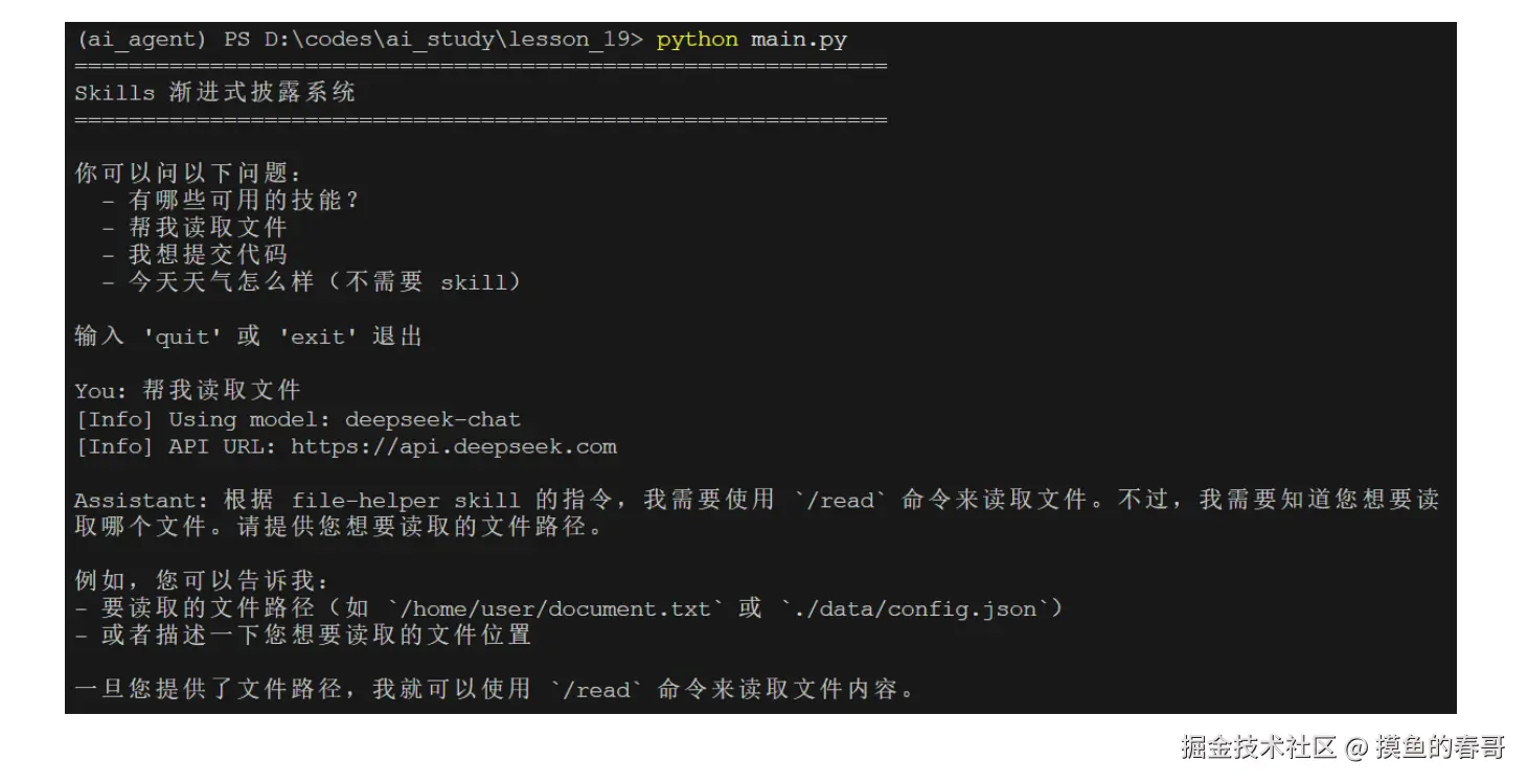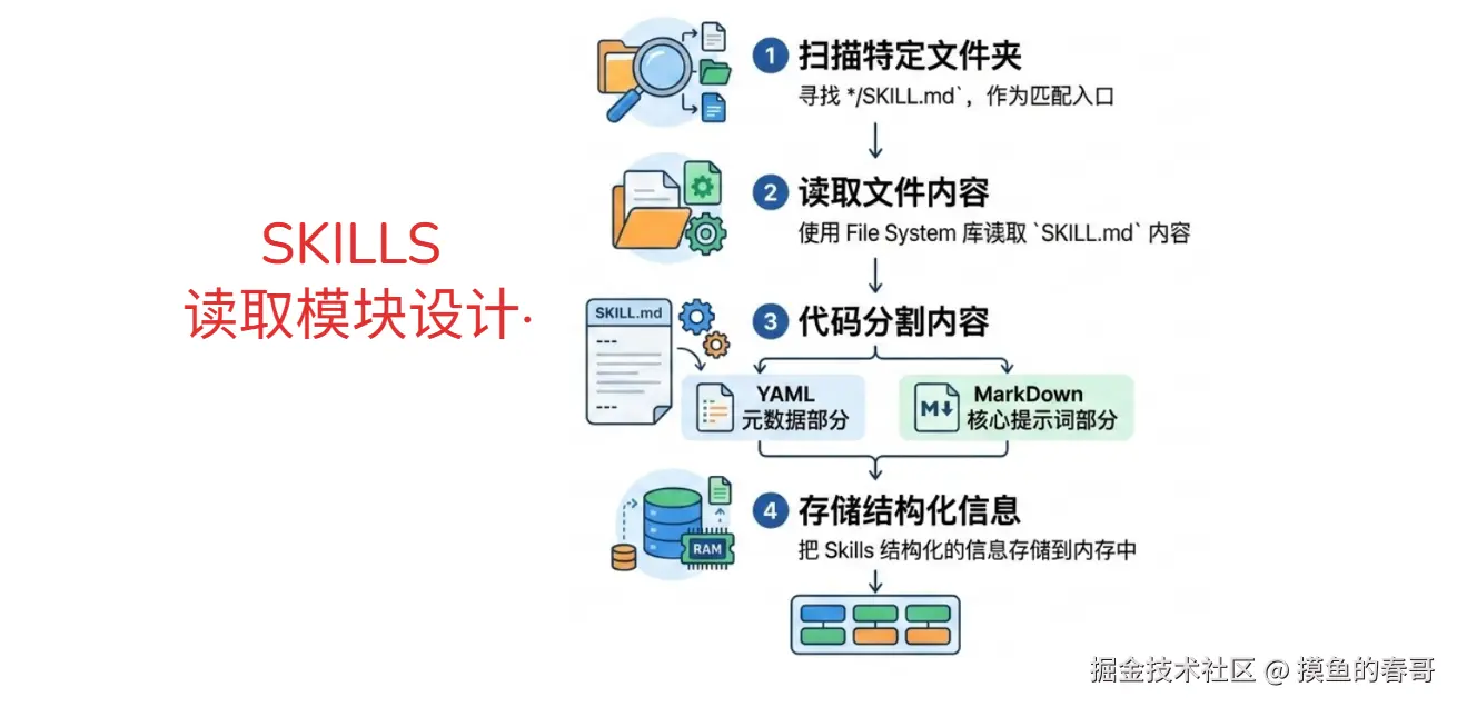 - Skills读取模块:扫描文件夹,结构化读取Skills的元数据与核心提示词。