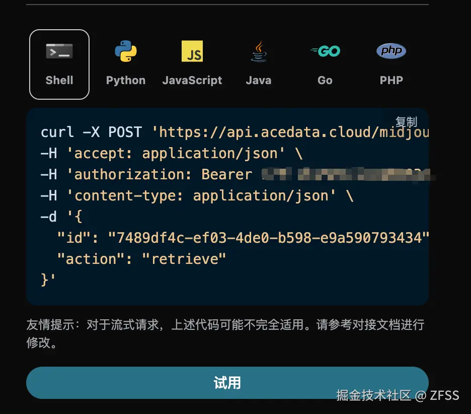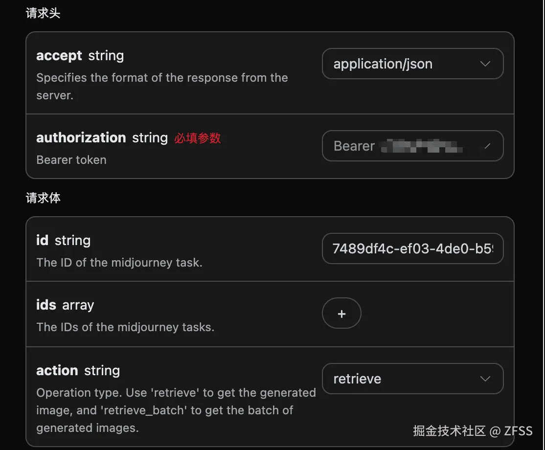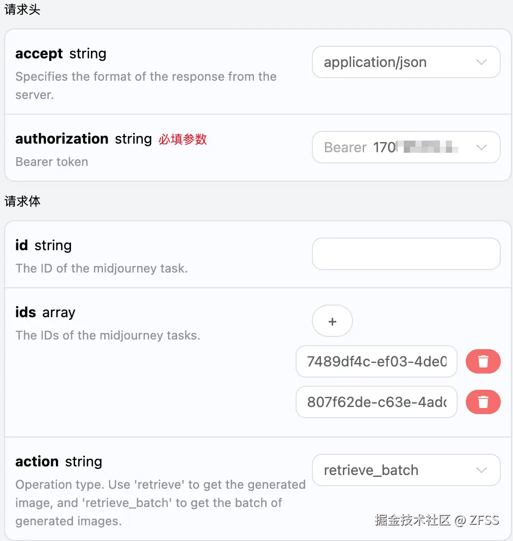 accept:指定接收 JSON 格式的响应结果,这里填写为application/json。authorization:调用 API 的密钥,申请之后可以直接下拉选择。