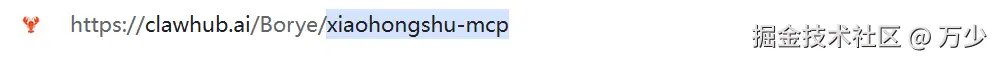 在浏览器的地址栏上直接复制 Skill 的名称"xiaohongshu-mcp",这个标识符用于后续的安装和调用。