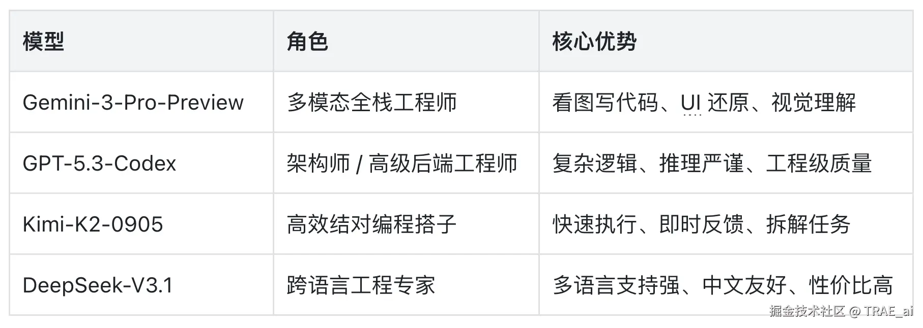 截止最新,TRAE 国际版 SOLO 模式已内置 包括 Gemini-3-Pro-Preview、GPT-5.3-Codex、 Kimi-K2-0905 以及 DeepSeekV3.1 在内的多款主流模型。