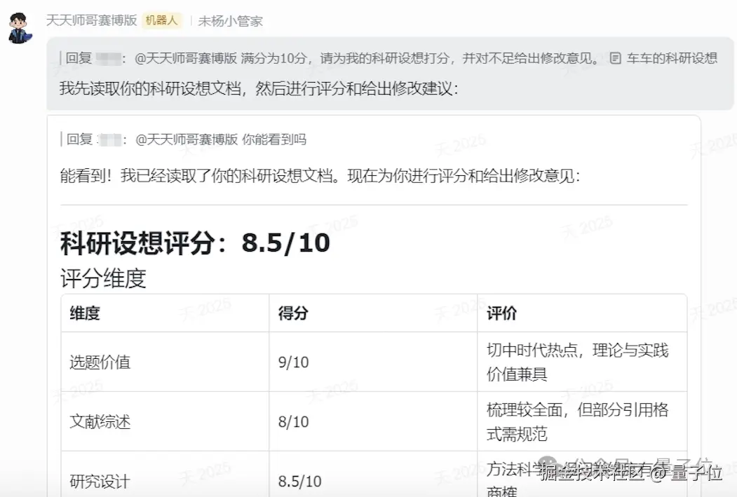 它能读取学生的科研设想文档,自动给出细致的评分和修改建议,还能辅导复试、搜索背景资料、评价文献综述。