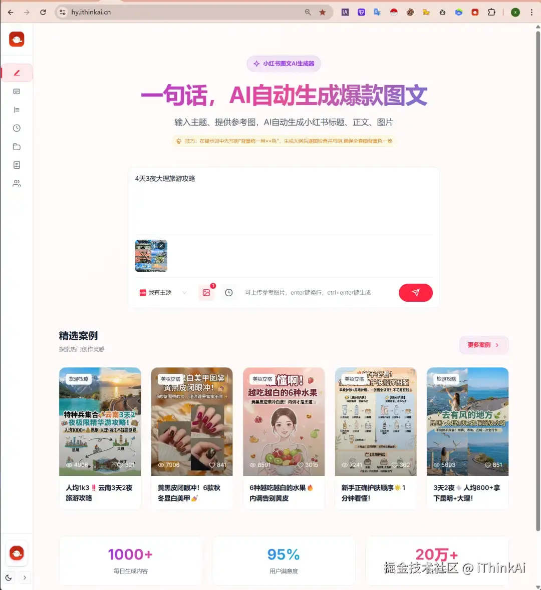 第一步:输入主题,也可以根据需要上传参考图。不管是“川西徒步路线”还是“高净值资产配置建议”,给它一个方向即可实现 小红书图文批量生成。