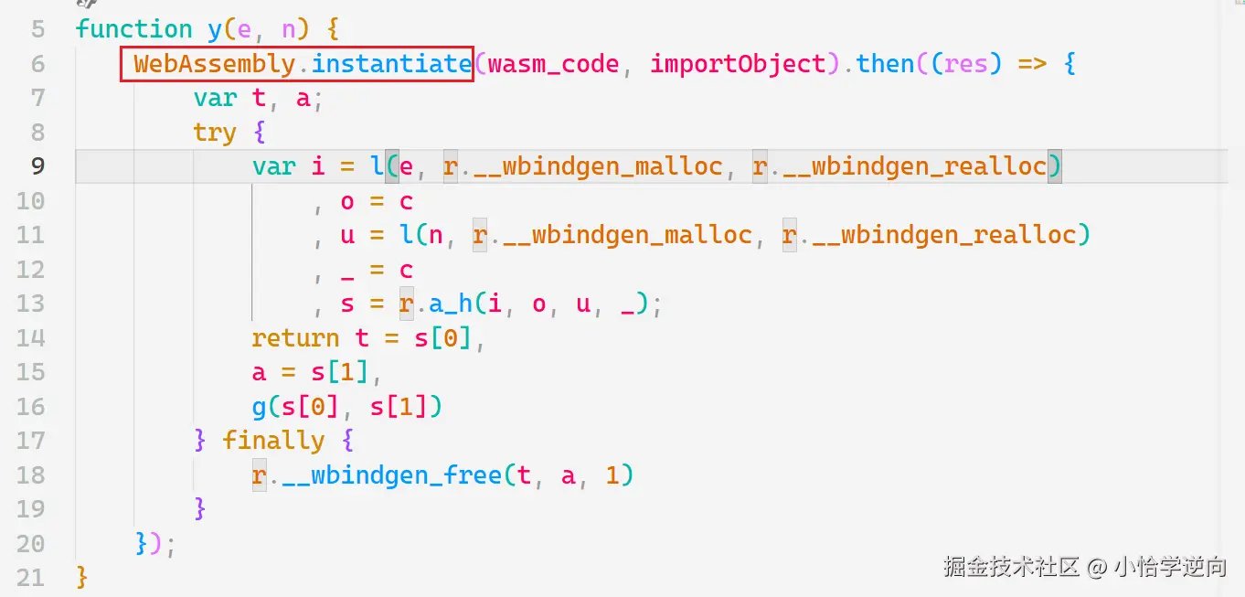 因为 WebAssembly.instantiate 是一个 异步 方法,所以最好把 y 函数里面的代码放入其中