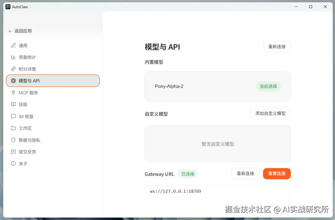 AutoClaw 支持多种 AI 大语言模型。进入设置页面,配置你想使用的模型。