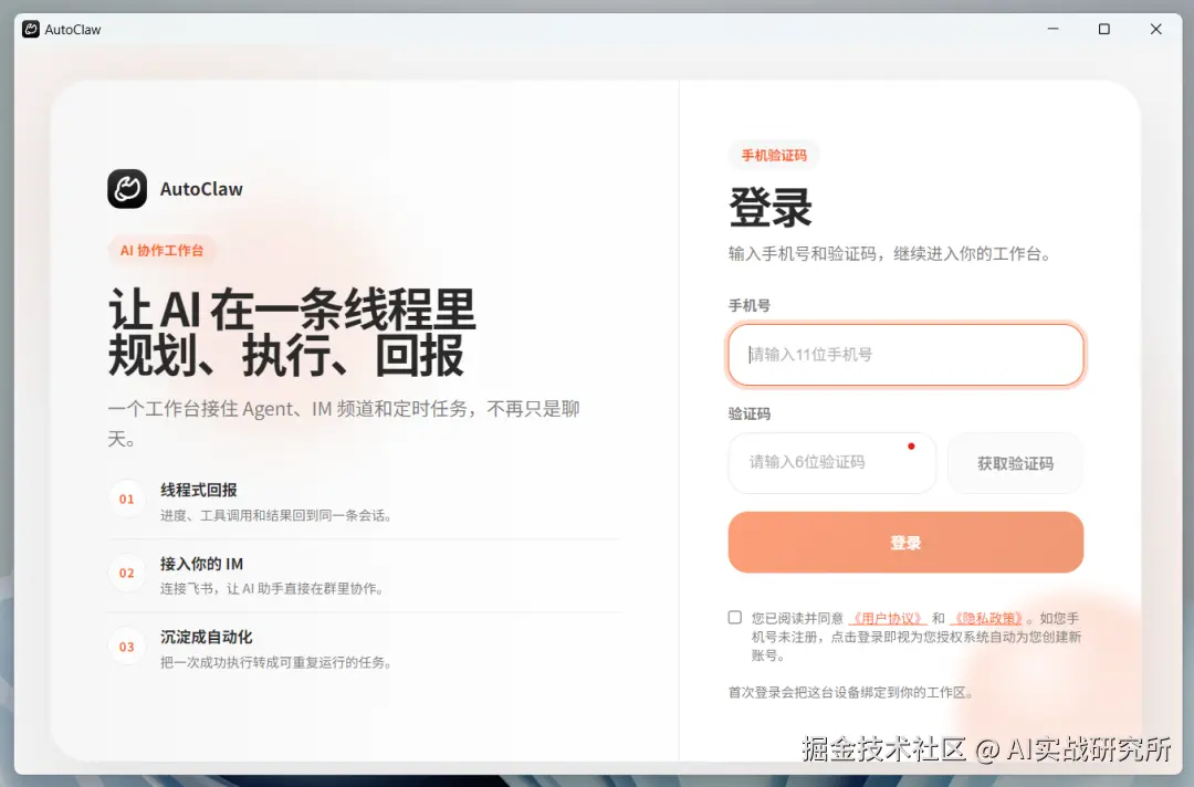 启动 AutoClaw 后,首先进入登录界面。