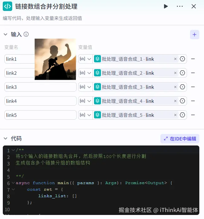 用代码整合开始节点的输入信息,若有自行上传的文案也一并处理。