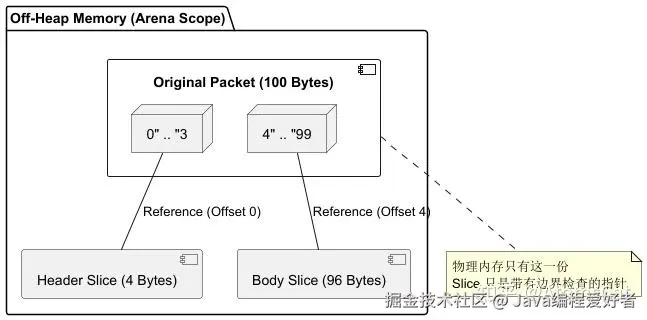 Netty 的 slice() 方法非常快,因为它不拷贝内存,只是创建了一个新的视图。MemorySegment 天生支持这个特性,而且 API 设计得更符合现代直觉。