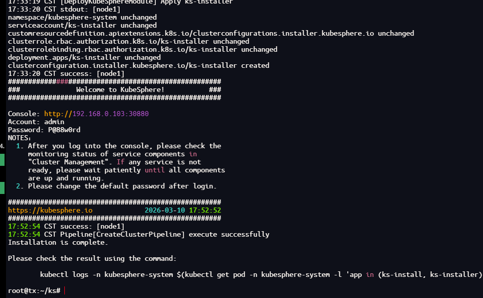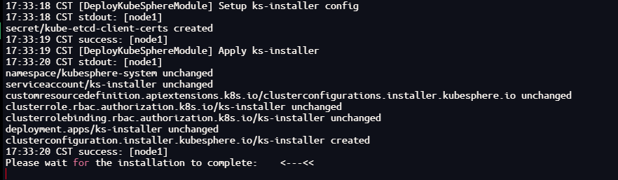 kubectl logs -n kubesphere-system $(kubectl get pod -n kubesphere-system -l 'app in (ks-install, ks-installer)' -o jsonpath='{.items[0].metadata.name}') -f