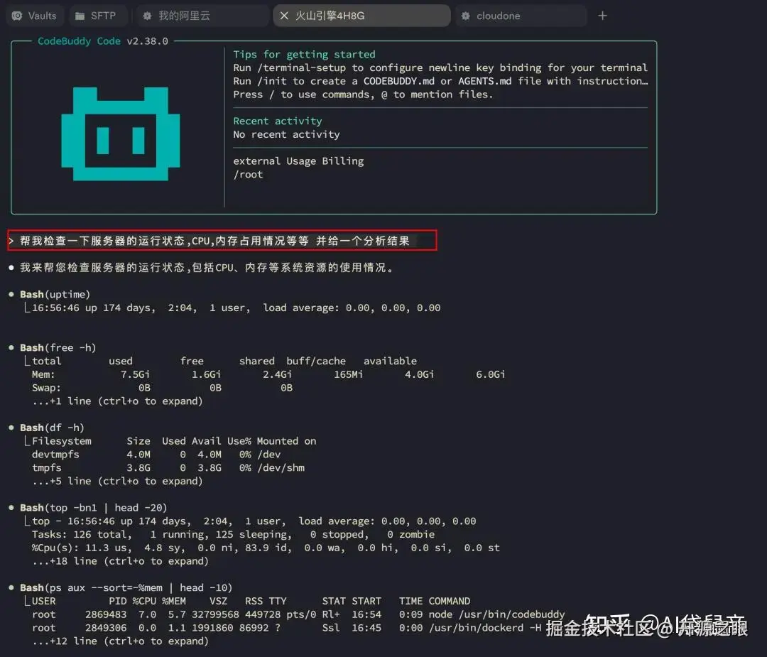 你看看,就单单是检查服务器运行状态这点,就比人来检查快了起码10倍,codebuddy code非常迅速的就执行了所有检查指令,将得到的信息分析总结摆在你面前。