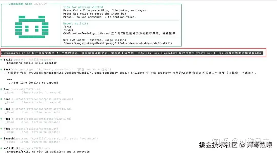 然后,我直接在CodeBuddy里加载了这个优化后的x-skills,试着生成了一条推文。
