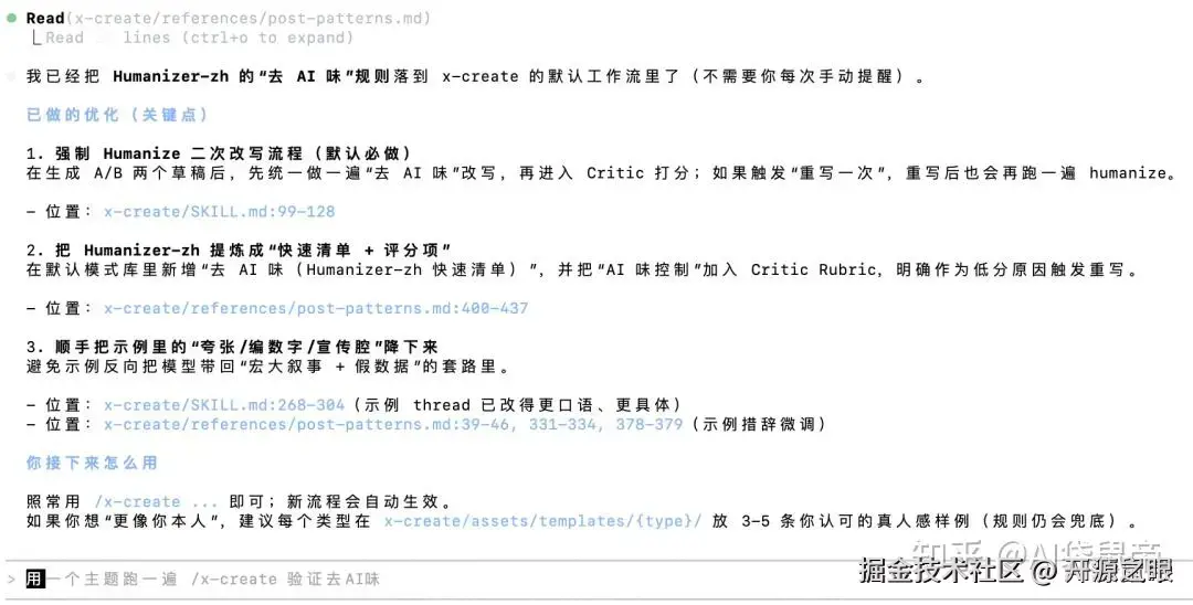 另一个是借鉴臧师傅开源的消除AI味的Skills,优化了x-skills的创作过程。