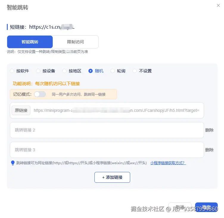 最重要的部分来了,进入【控制台】找到刚刚创建的那条短链接,点击右侧的【智能跳转】按钮,选择【随机】模式,接下来,就可以详细配置多个跳转链接了。
