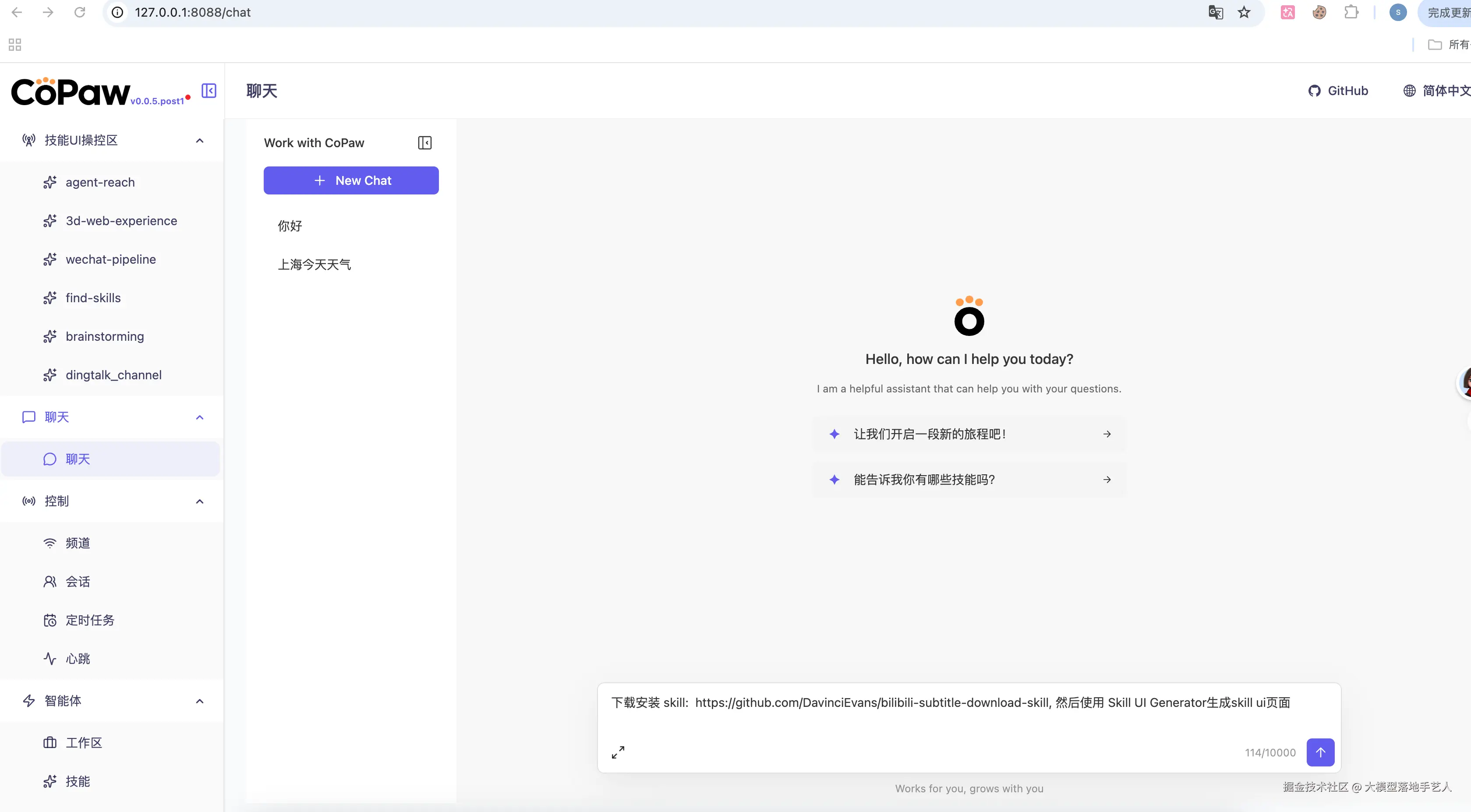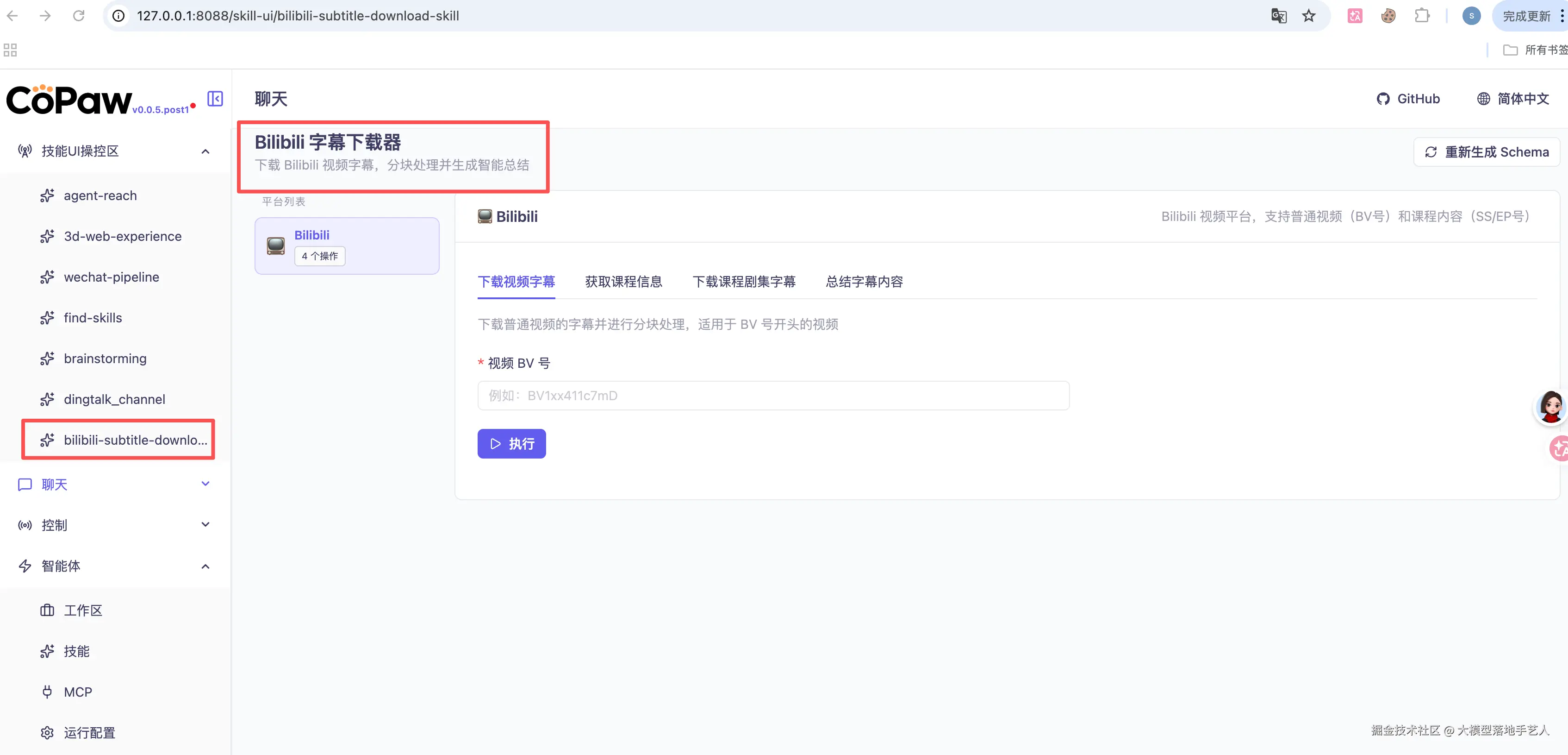 打开CoPaw控制台,进入「聊天」页面,找到你想使用的Skill(如bilibili-subtitle-download-skill),然后输入“下载安装 skill: github.com/DavinciEvan…, 然后使用 Skill UI Generator生成skill ui页面”就完成安装。安装成功如下(如果左侧没有显示,刷新下页面)