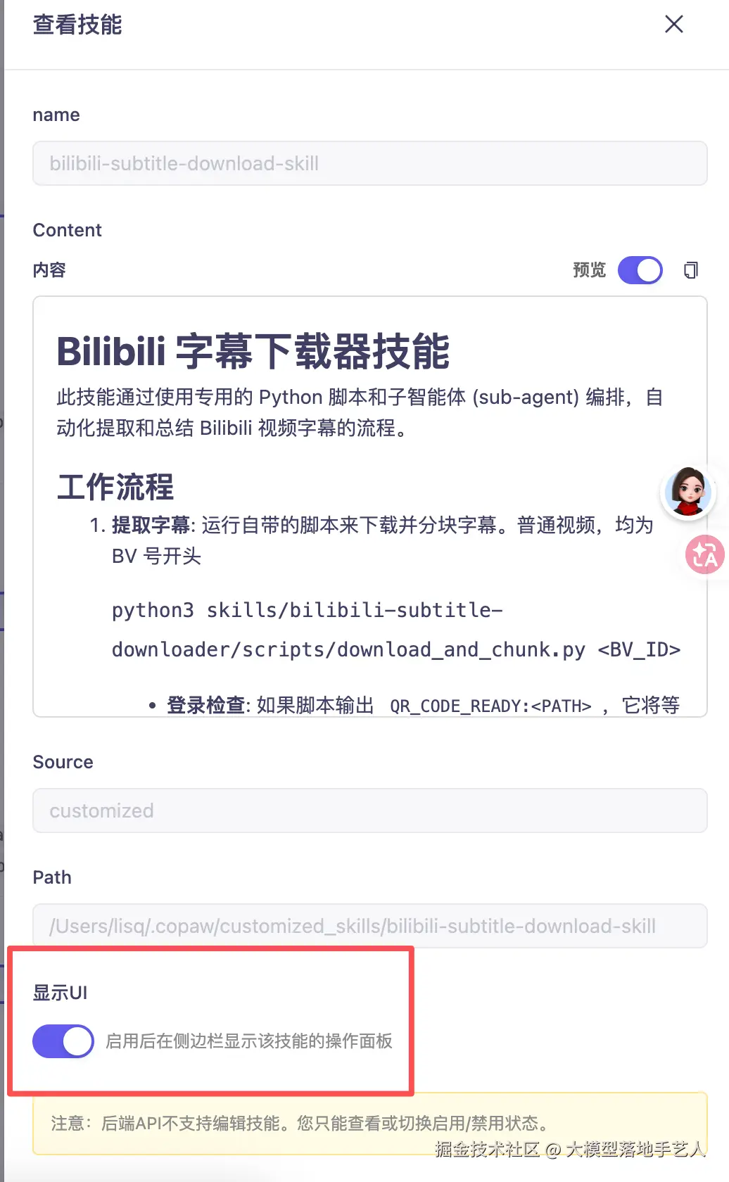 从侧边栏“技能”菜单进入技能该列表页,找到安装的bilibili-subtitle-download-skill,点击它显示如图的控制“显示UI”,关闭它,对应的技能UI操控区就不显示该技能。