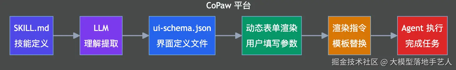 - 复用Schema:将CoPaw生成的ui-schema.json直接放入OpenClaw的Skill目录,零成本复用;
