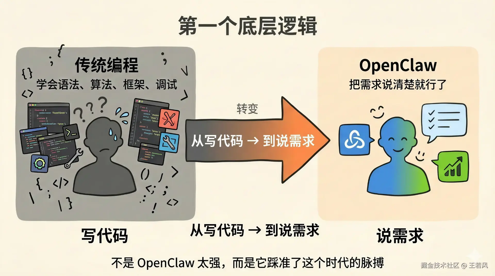 OpenClaw 不一样。它的核心不是让你写代码,而是让你说需求。