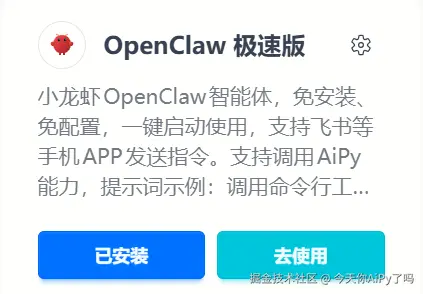 这里点下安装,会比较慢,耐心等待一点时间,安装好后,就能点击使用,一键打开openclaw