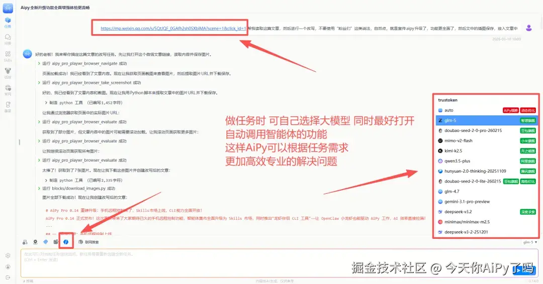 打开自动选择智能体后,AiPy根据任务需求使用技能,比如我这篇文章,我让AiPy获取别人的文章,然后读取,进行一个仿写,并且保存图片,嵌入到文章中