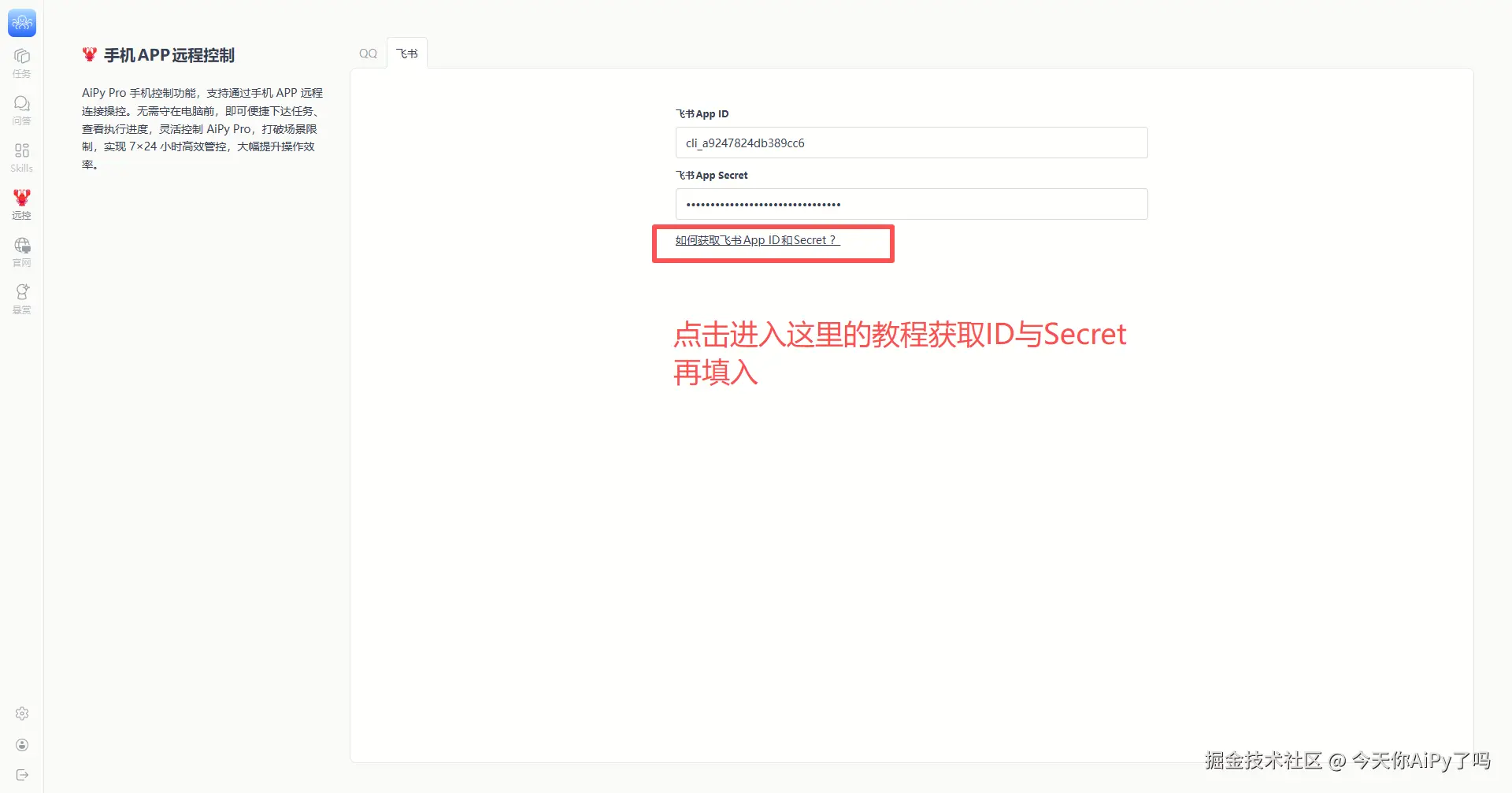 这里填入创建的飞书机器人ID与Secret,飞书机器人ID与Secret获取方法,在02章节
