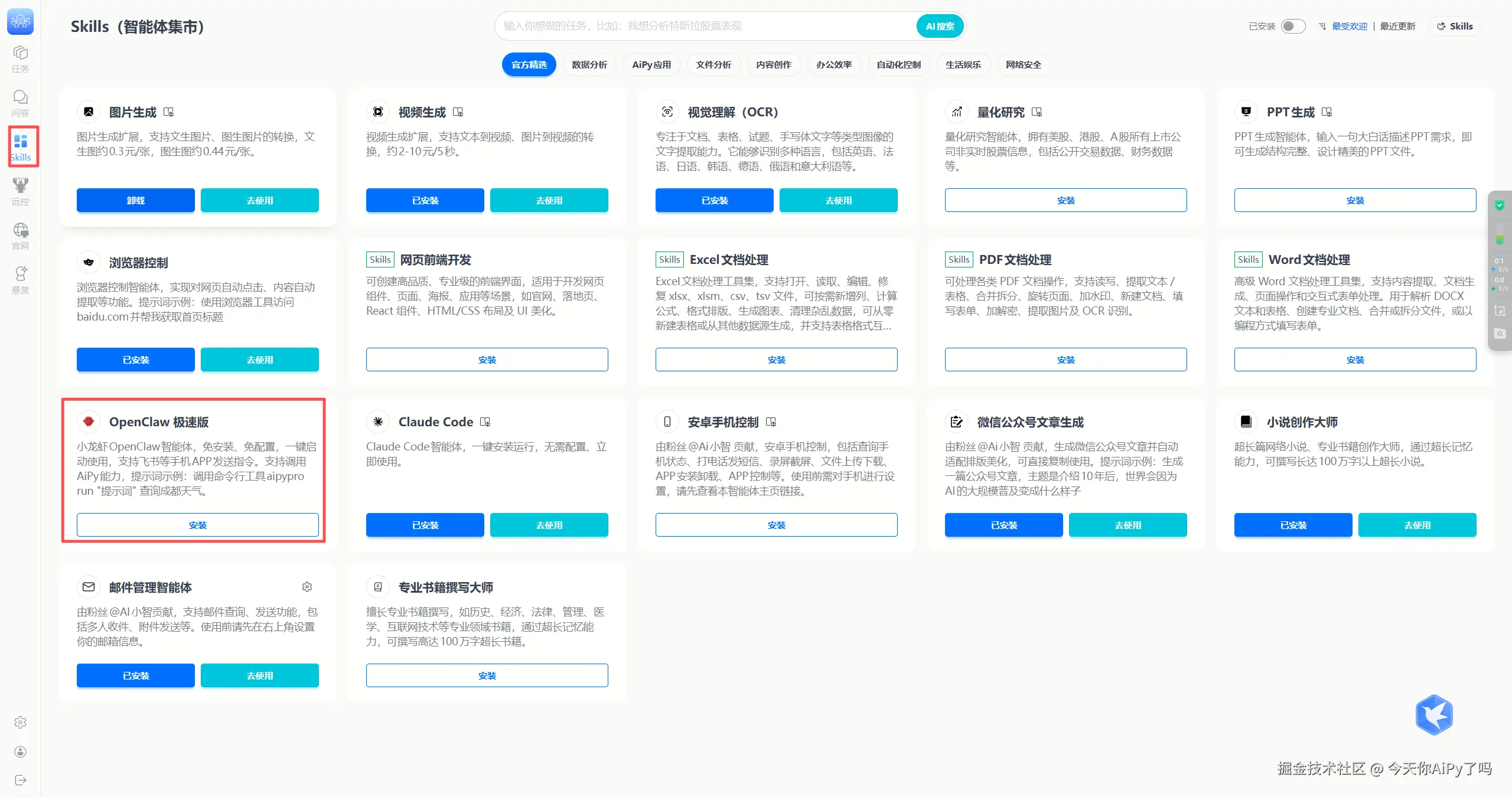 Skills 市场一键安装 OpenClaw 极速版智能体,安装完直接运行,零门槛上手!