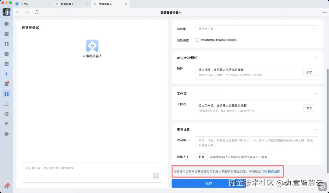 可在客户端-工作台,点击-智能机器人-创建机器人,选择API模式创建。
