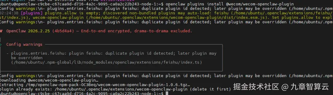 登录服务器,输入以下命令,安装企微插件。(安装需要2-5分钟)