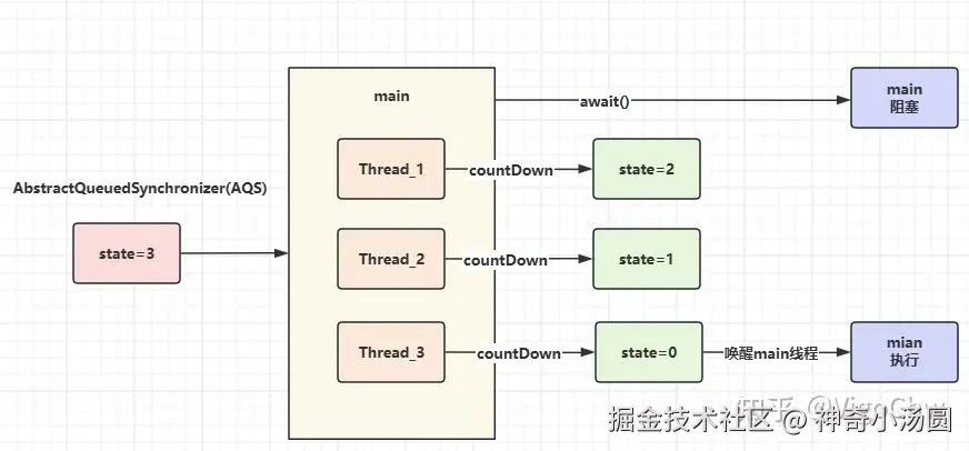 countDown()通过 CAS 原子将 state 减 1,state 为 0 时唤醒等待队列中的线程。await()判断 state:大于 0 则阻塞当前线程并加入等待队列;state 为 0 时直接放行。