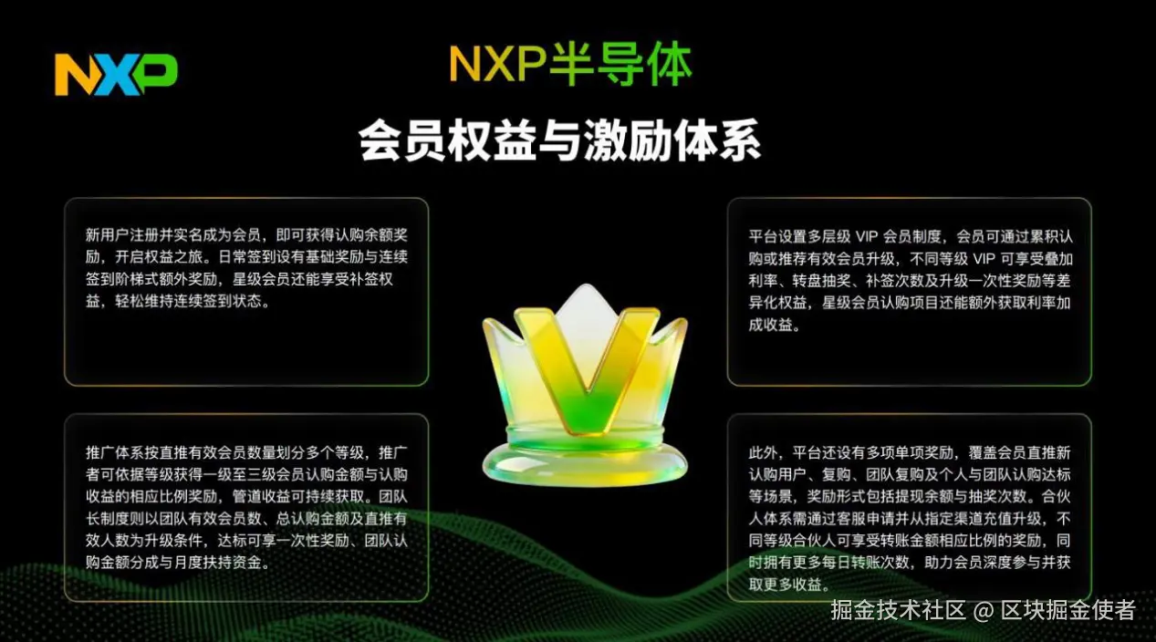 NXP半导体全方位会员权益与激励体系于 2026/2/01 正式进入中国地区运营。该体系涵盖注册、签到、等级、推广、团队、单项奖励及合伙人七大维度,新用户注册有礼、签到享阶梯奖励,推广 / 团队可获分级收益,VIP 与合伙人拥有专属权益,多维度为会员提供成长路径与多元收益,深度联动用户生态。